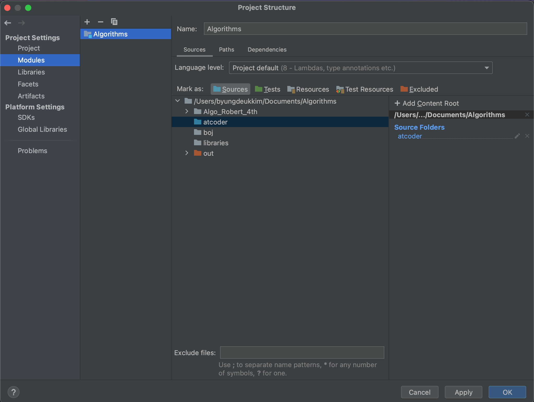 다음으로 Modules 탭으로 넘어간다. Language level은 project default로 두면 default 값을 따라간다. 여기서 원하는 폴더를 선택한 뒤에 Mark as Sources를 하면 해당 폴더가 파란색으로 변하면서 프로젝트에서 설정한 언어 소스 폴더로 변한다.