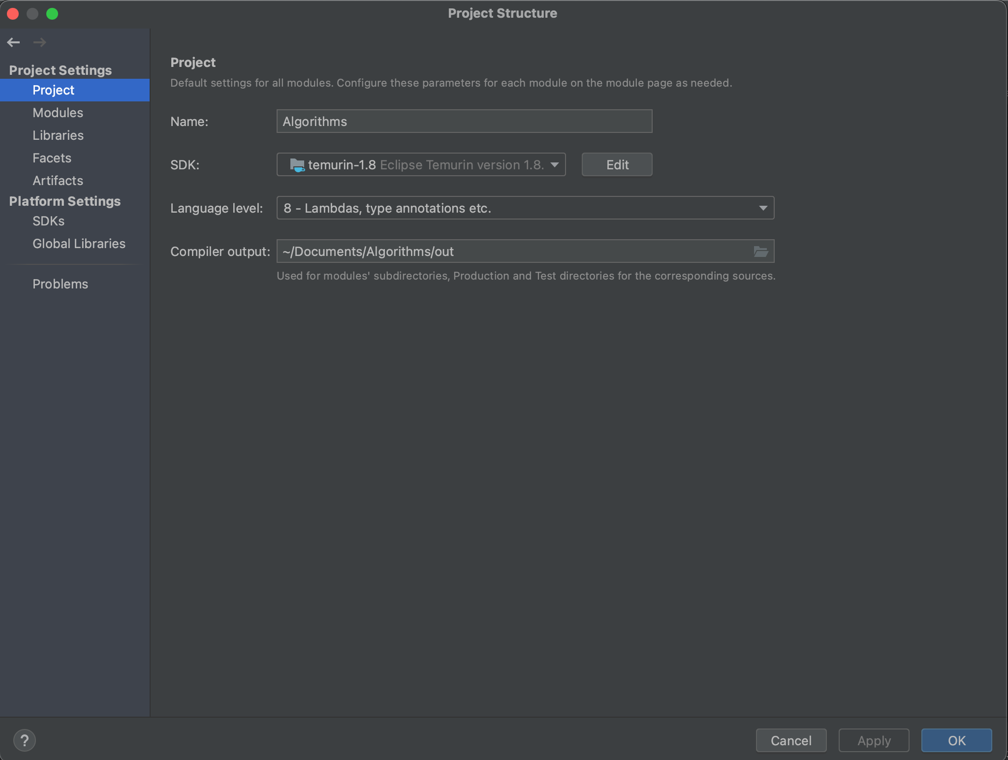 프로젝트 폴더 우클릭 후 Open Module Setting으로 들어간 뒤 왼쪽 메뉴에서 Project를 선택하면 다음과 같은 창이 나온다. 아래에서 원하는 SDK, Language level을 선택하면 된다. Compiler ouput에 나와있는 path는 파일을 컴파일 했을 때 그 결과물이 저장되는 곳이다.
