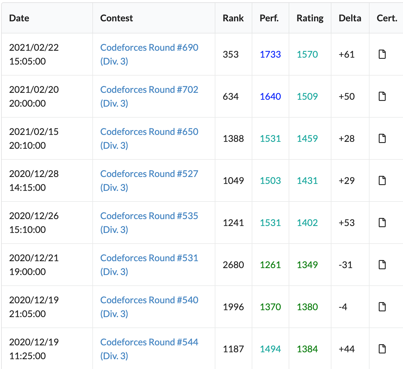 결과는 개떡상 ㄷㄷ; 내 실력이 이렇게 늘었나 싶을 정도 ;; 2월 21일에도 Round 697 버추얼 돌렸는데, 대회가 언레돼서 그런지 코드포스 애니타임에 반영이 안 됐다. 그 대회에서도 1700대 문제까지 다 풀었으니 퍼포먼스가 최소 1700로 예상된다. 평균 퍼포가 1700대를 넘어서기 시작했고 1800대 1900대 문제도 아이디어가 약간 모자라거나 시간이 조금 모자라서 못 푸는 경우가 많은 거 보면 블루 상위권까지 빠르게 올라갈 수 있을 거 같다. 이게 다 라이갓갓님과 솔브드 클래스 제작자 덕분이다. 질 좋은 문제를 많이 접해서 실력이 빨리 올랐다. 조만간 코포 참가해서 빨리 레이팅을 1600대로 맞춰놔야겠다.
